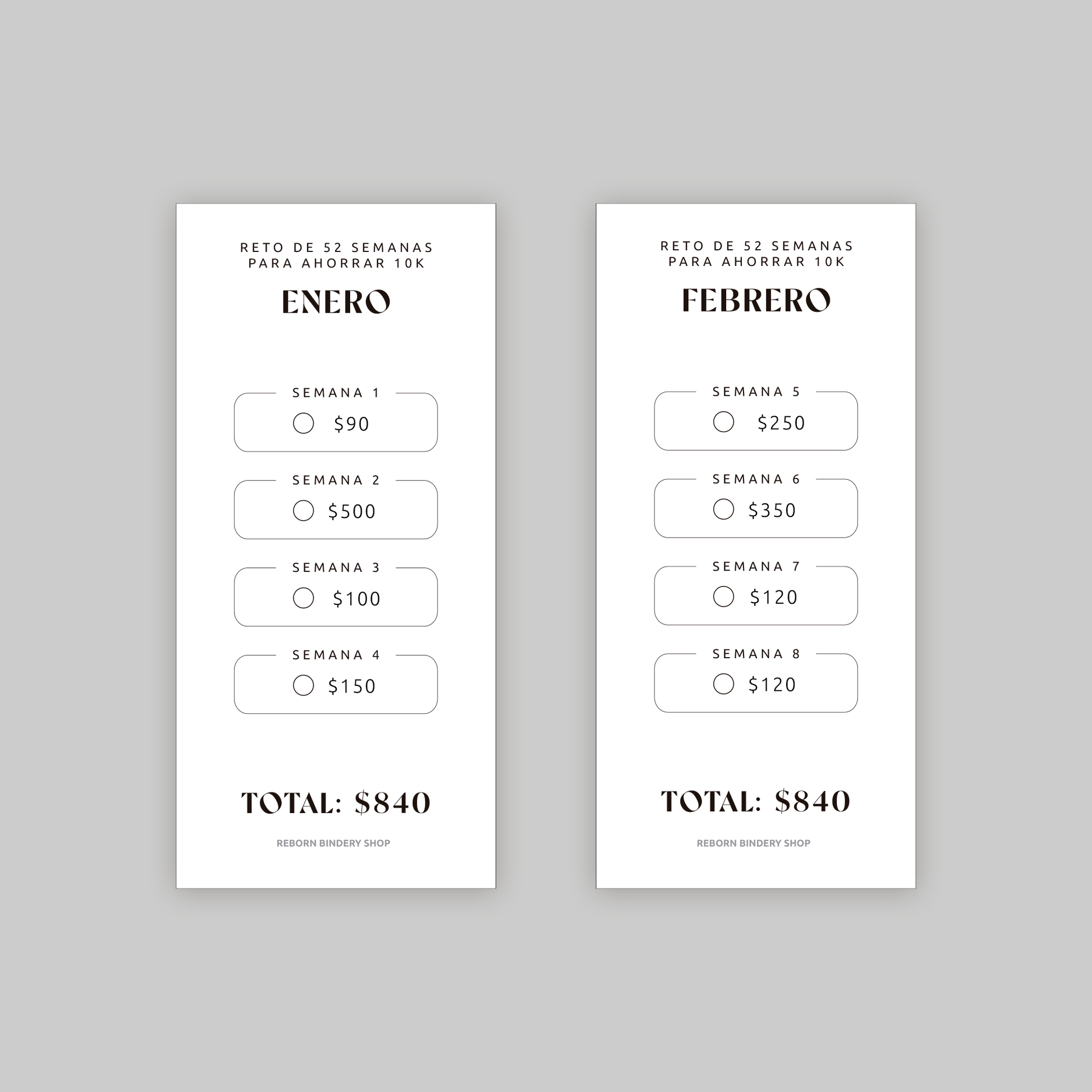 - 12 retos mensuales: Cada reto incluye 4 cantidades diferentes para ahorrar según tus objetivos.