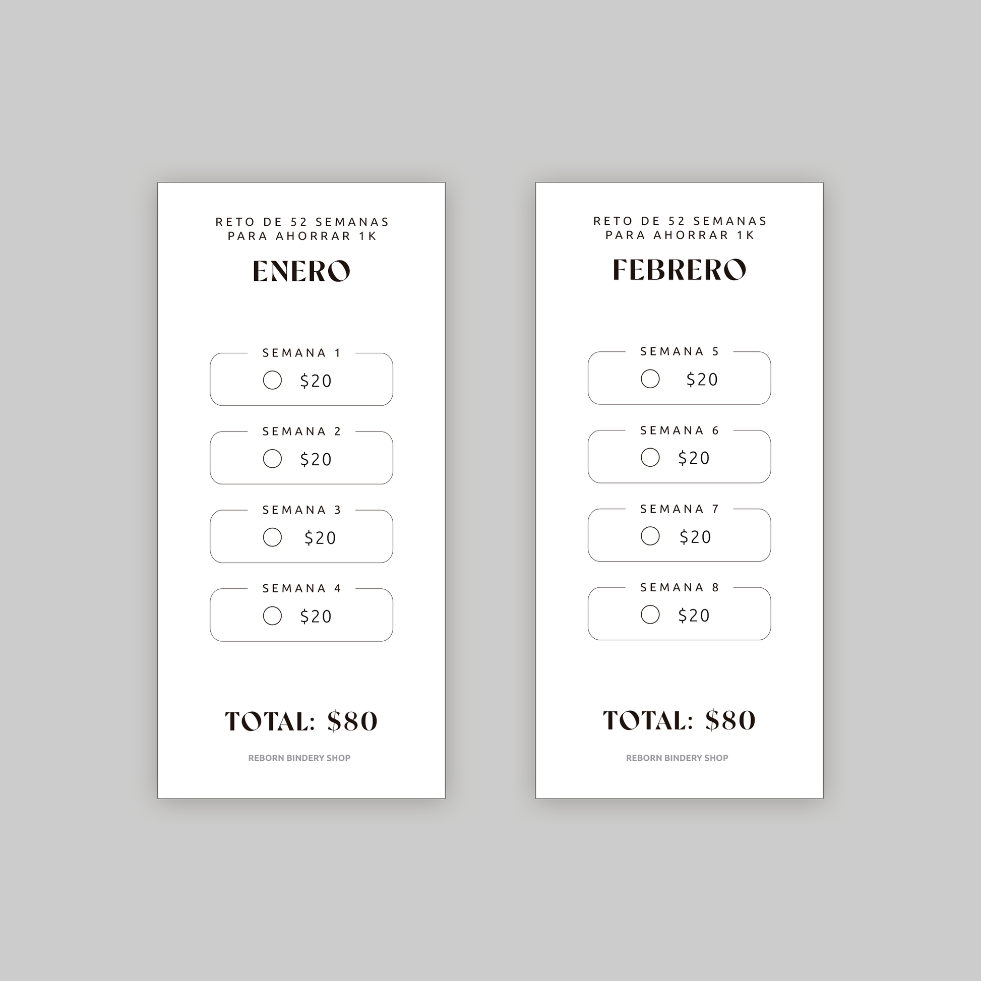 El paquete de sobres reutilizables de desafío de ahorro mensual está diseñado para aquellos con objetivos de ahorro y respalda esos objetivos con desafíos de ahorro semanales o quincenales. ¡Simplemente decide cuánto quieres ahorrar y elige el paquete que se ajuste a tu objetivo!